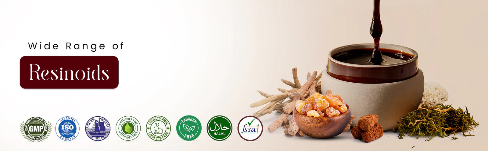 Resinoids are extracted from naturally resinous plant matter e.g. balsams, gum resins, and natural oleoresins via hydrocarbon solvents. It predominantly contains non-volatile, resinous compounds, often used in fragrances as aroma fixative.